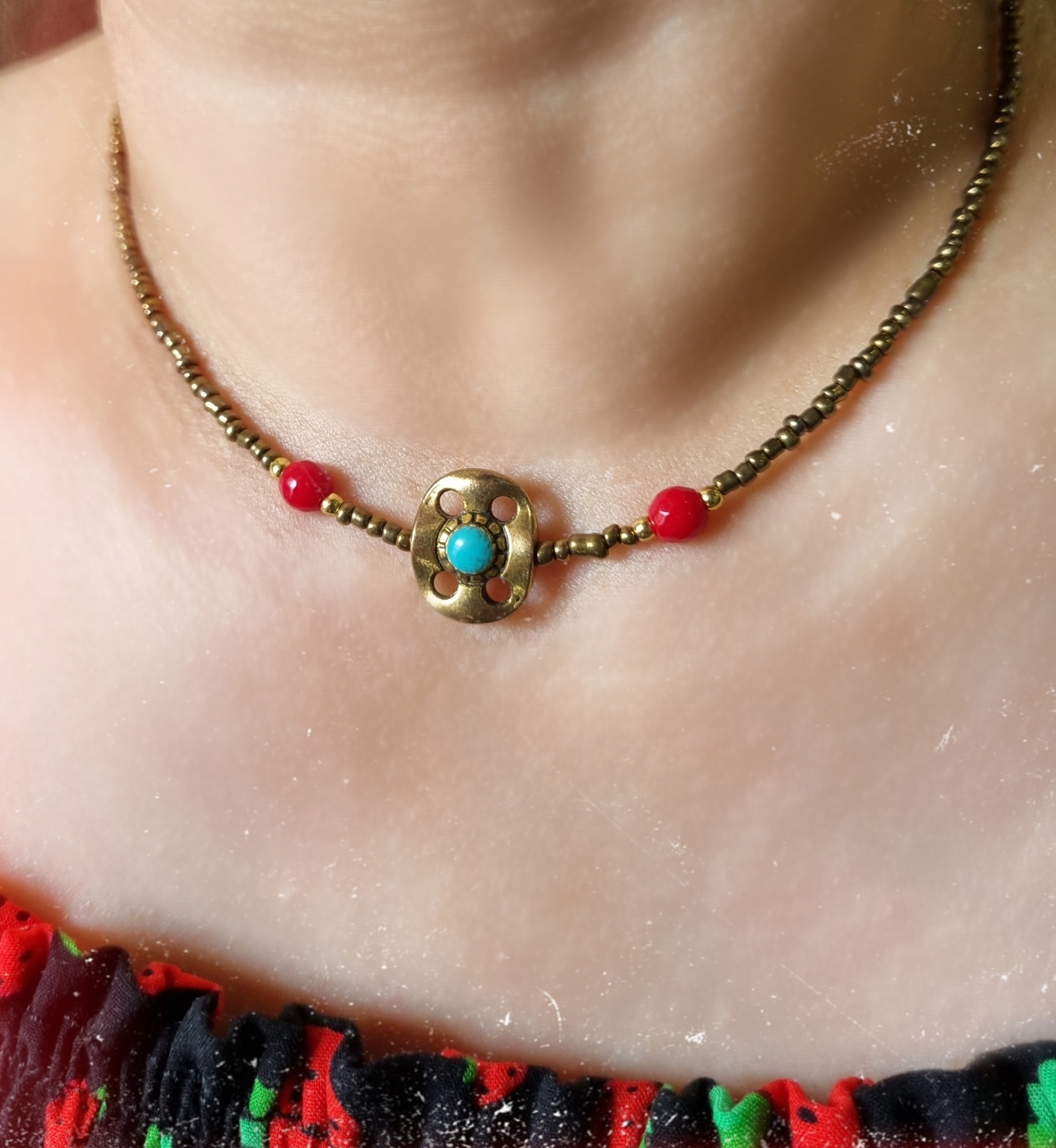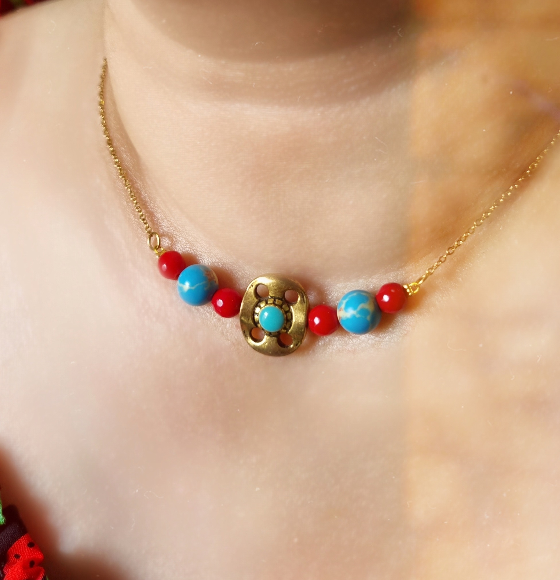 گردنبند فیروزه و مرجان با آویز تبتی