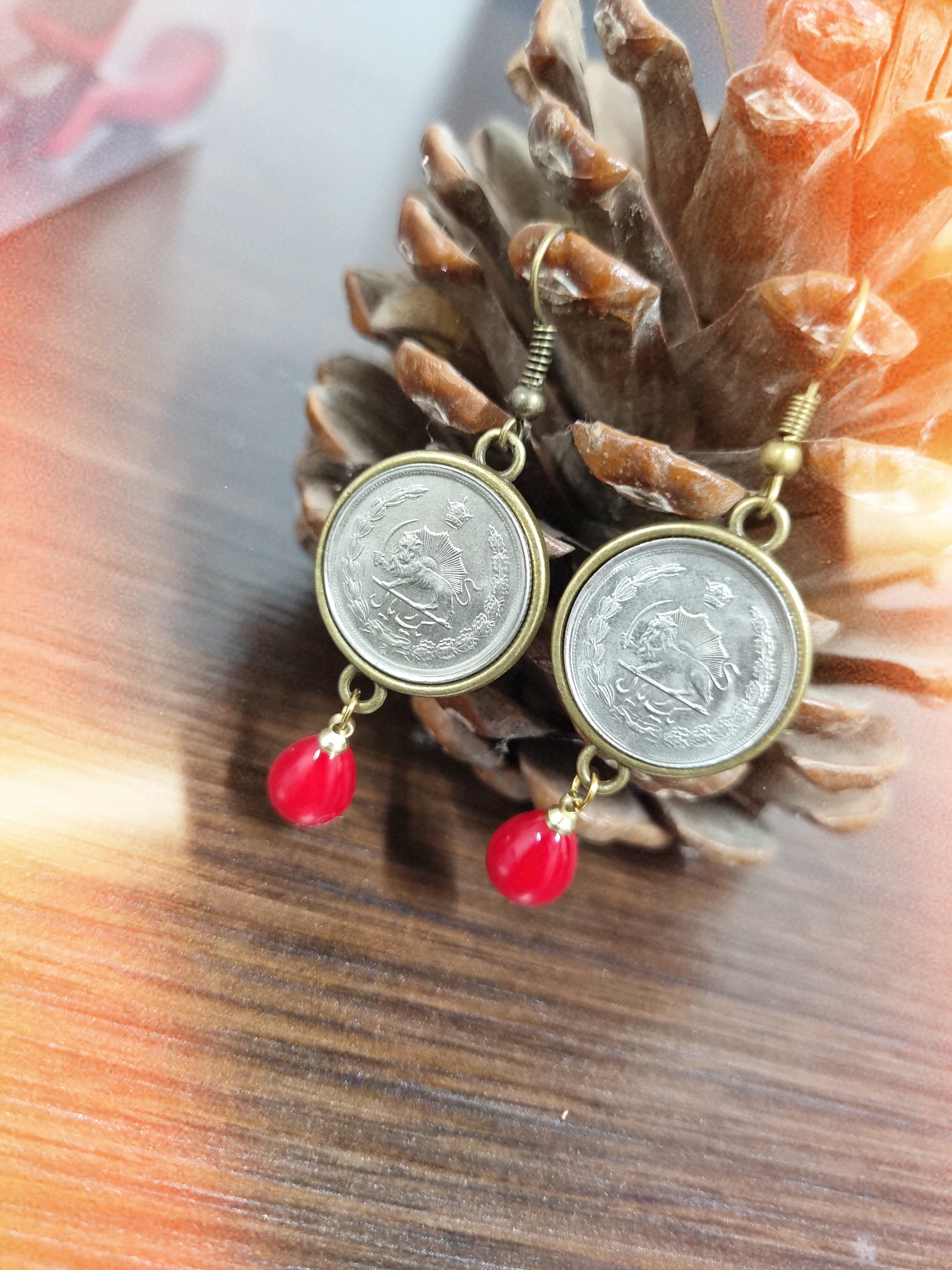 متریال گوشواره از جنس برنزی و سکه ۱ ریالی اصل از جنس نیکل و آویز مروارید اشکی قرمز میباشد .