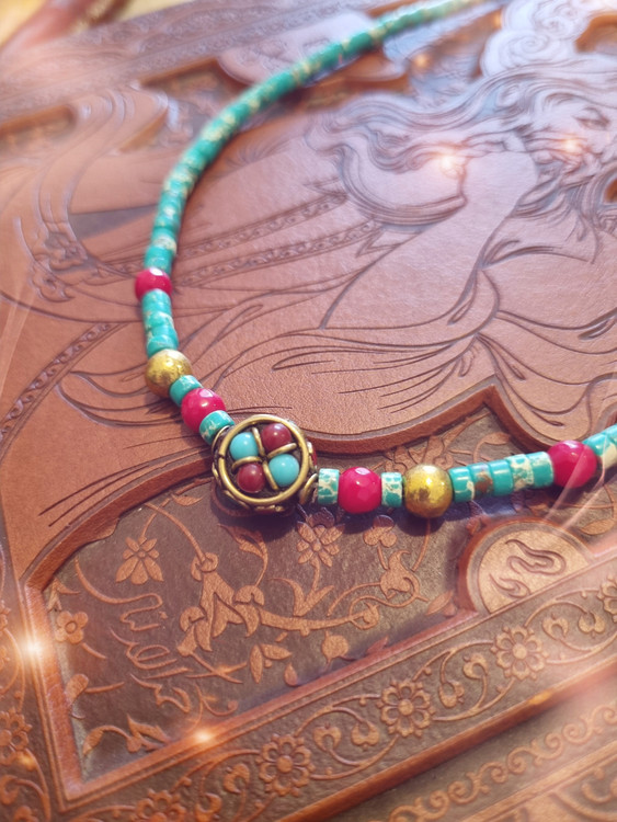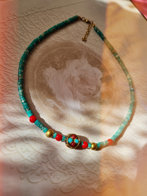 دستهبندی: گردنبند فیروزه و مرجان با آویز تبتی