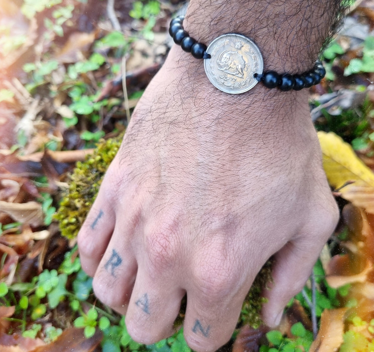 دستبند ساخته شده از سنگ اونیکس مشکی مات و سکه اصل قدیمی از جنس نیکل و کار دارای قفل کشویی میباشد .