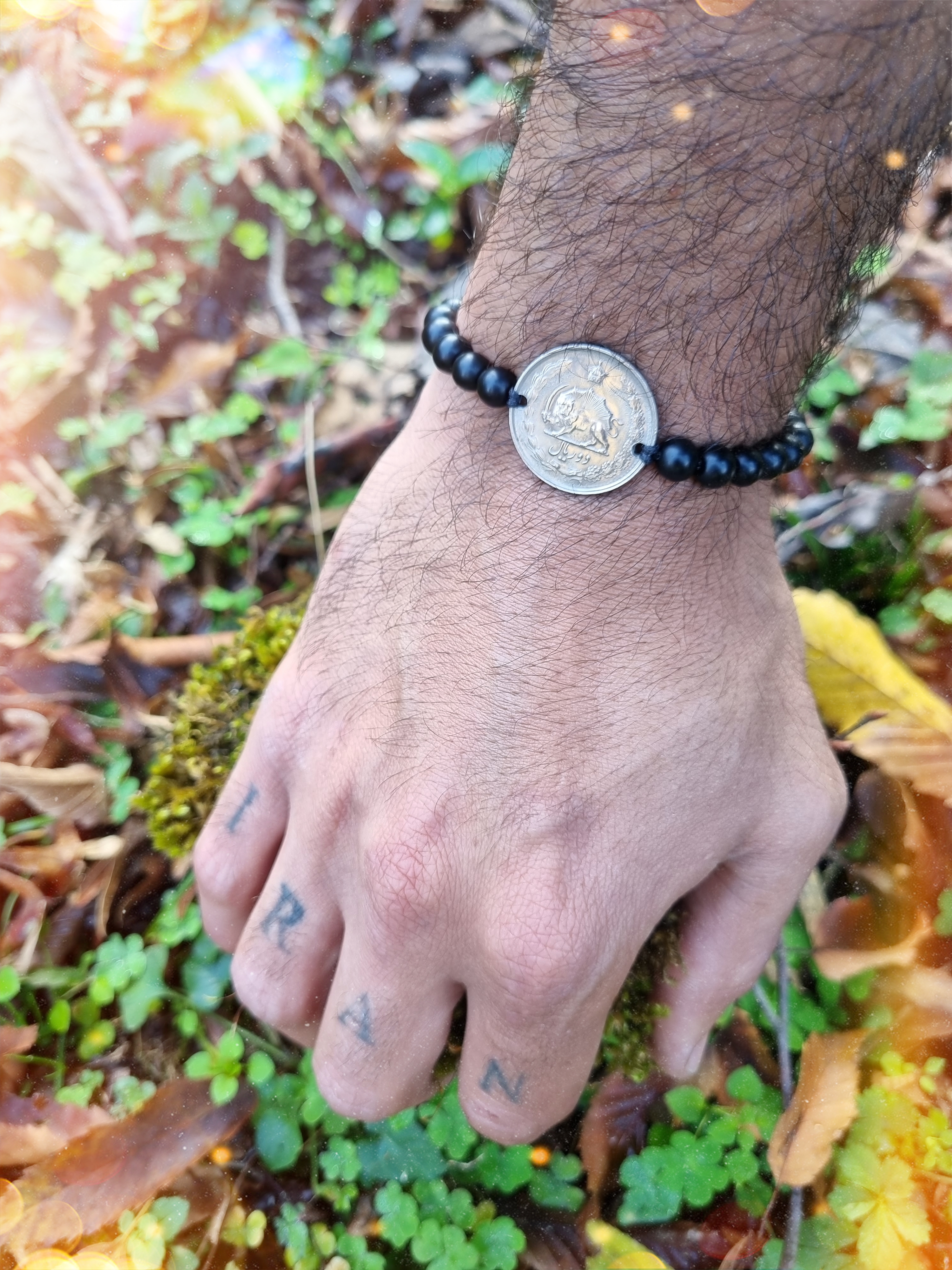 دستبند ساخته شده از سنگ اونیکس مشکی مات و سکه اصل قدیمی از جنس نیکل و کار دارای قفل کشویی میباشد .