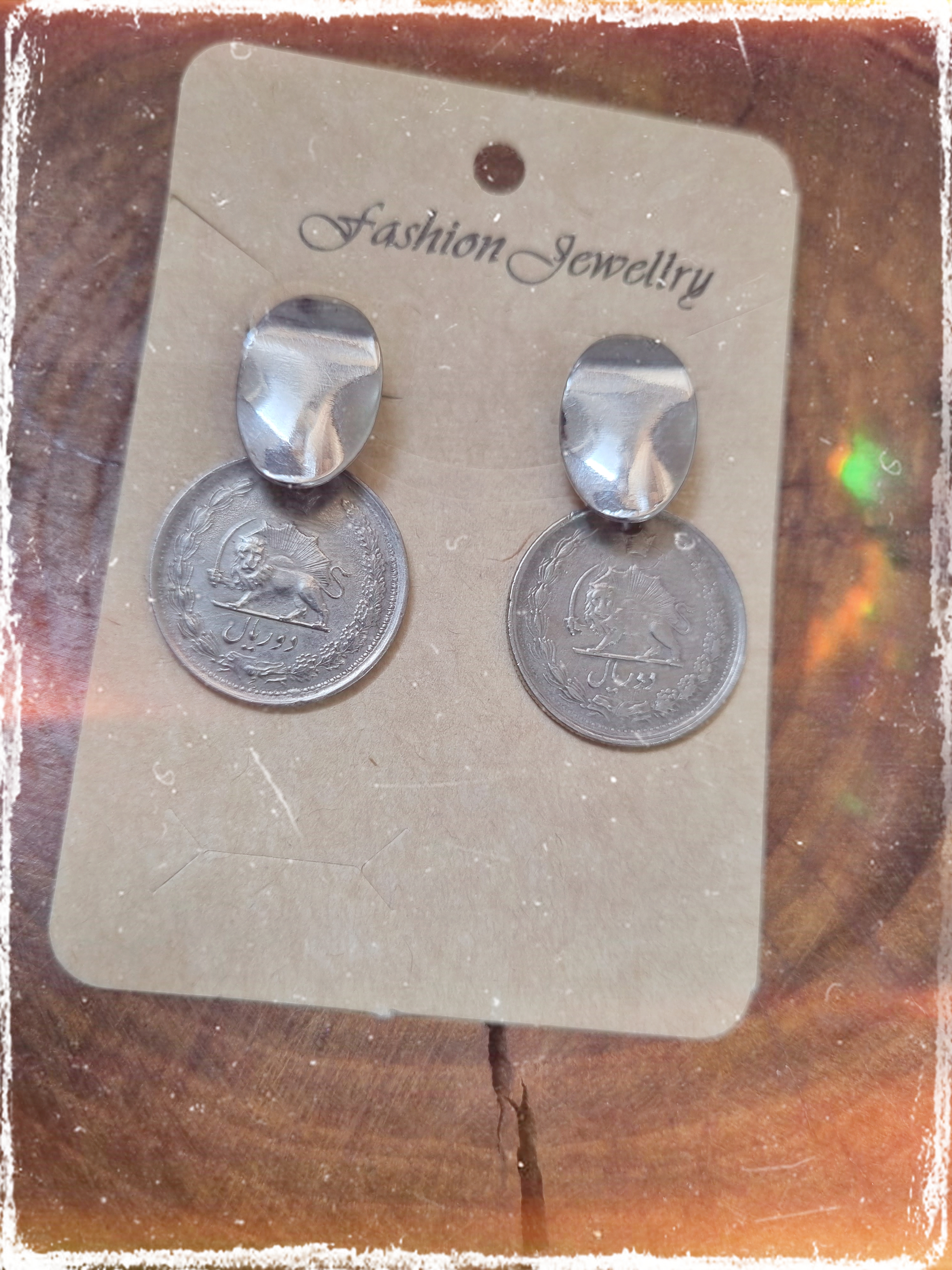 گوشواره سکه قدیمی اصل ترکیب شده با متریال استیل رنگ ثابت طراحی منحصر بفرد ترکیب مدرن و کلاسیک سبکی متفاوت برای استایل های مدرن