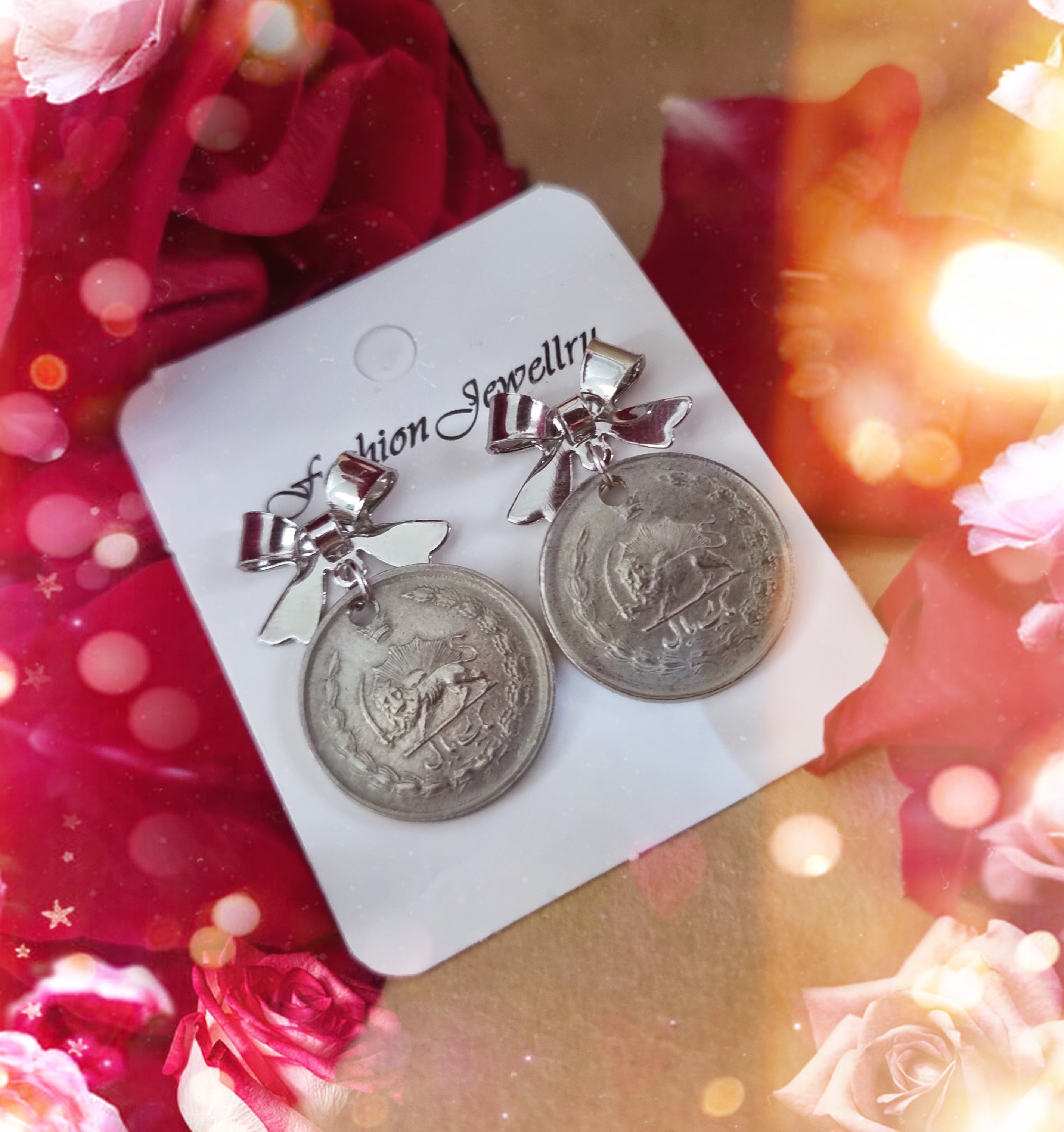 گوشواره ساخته شده از سکه ۱ ریلی اصل قدیمی از جنس نیکل و پاپیون استیل رنگ ثابت ،ضد حساسیت .