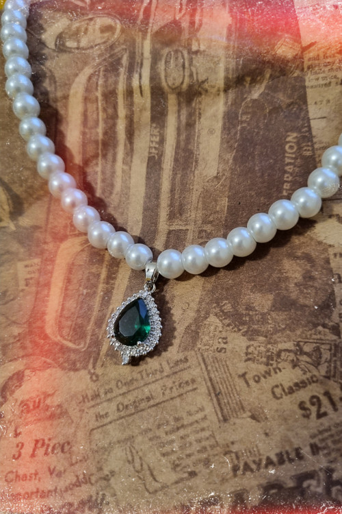گردنبند مروارید با آویز طرح جواهری با سنگ زمرد سبز